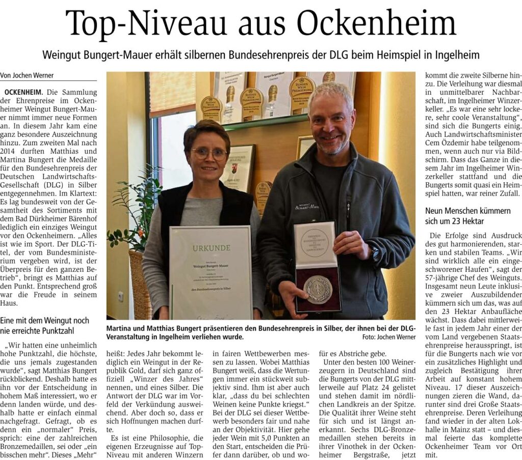 Am Donnerstag, den 27.10.2023, durften wir vom Bundesministerium für Ernährung und Landwirtschaft (BMEL) unseren achten Bundesehrenpreis entgegennehmen. Und diesen sogar in Silber! Das bedeutet, dass wir nicht nur in Rheinhessen, sondern bundesweit das zweitbeste Ergebnis erzielt haben. Darüber freuen wir uns unglaublich!